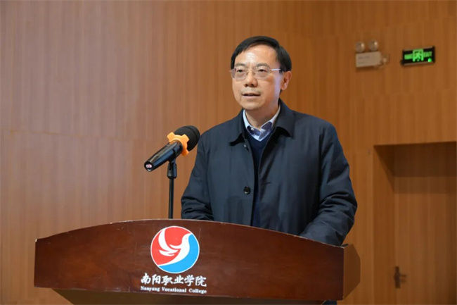 南阳职业学院党委书记魏文君致欢迎辞,并详细介绍了邓志军同志的先进事迹与杰出贡献。他指出,邓志军同志作为河南省连续三届人大代表,三十六载深耕实业,始终秉持“诚信立业、回报社会”的初心,带领企业铸就了不欠税款、不欠工资、不欠账款、不欠本息,无失信违法记录、无违约合同的“四不欠两没有”诚信标杆。其探索创新的基层治理“诚城模式”获中组部推广,个人捐资打造全国首座中原诚信博物馆,累计创造就业岗位5000余个,公益捐赠超亿元,先后荣获全国优秀党务工作者、“中国好人”等多项国家级荣誉,是新时代诚信价值与企业家精神的生动典范。