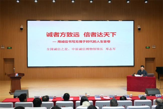本网讯 为深入学习贯彻党的二十届四中全会精神,全面落实关于“弘扬诚信文化”的部署要求,12月30日,南阳职业学院“伏牛山大讲堂”第三十三期特邀全国劳动模范、全国诚信之星、河南诚城集团党委书记、董事长邓志军作题为《诚者方致远 信者达天下》的专题报告。报告会在学校图书馆报告厅举行,由校党委书记魏文君教授主持。诚城集团及诚城社区有关代表、学校领导班子成员与近四百名师生代表共同参加了报告会。