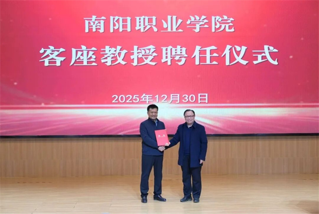 南阳职业学院党委副书记、校长郭建生代表学校向邓志军颁发客座教授聘书。