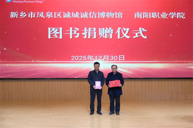 邓志军代表中原诚信博物馆向南阳职业学院赠送《诚信中国》系列丛书,郭建生向其颁发捐赠证书。
